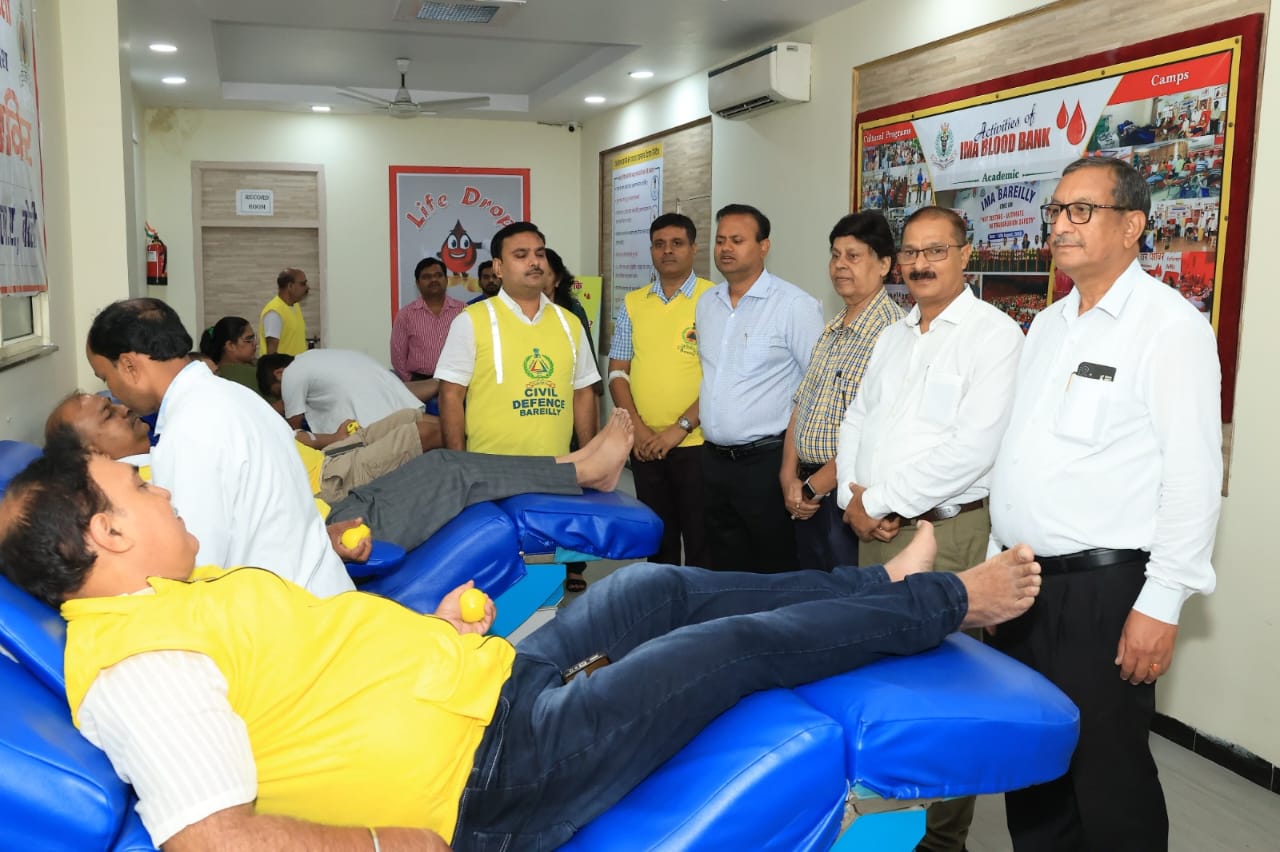 *बरेली।आज नागरिक सुरक्षा कोर बरेली के तत्वाधान में चीफ़ वार्डेन राजीव शर्मा एवं डिप्टी कन्ट्रोलर राकेश मिश्र के नेतृत्व में सिविल डिफेंस के वलियन्टीयर्स द्वारा रक्तदान शिविर का आयोजन आईएम ए ब्लड बैंक सिविल लाइन्स में किया गया, रक्तदान शिविर का शुभारंभ ज़िलाधिकारी नागरिक सुरक्षा के नियंत्रक श्री रविन्द्र कुमार ने किया।