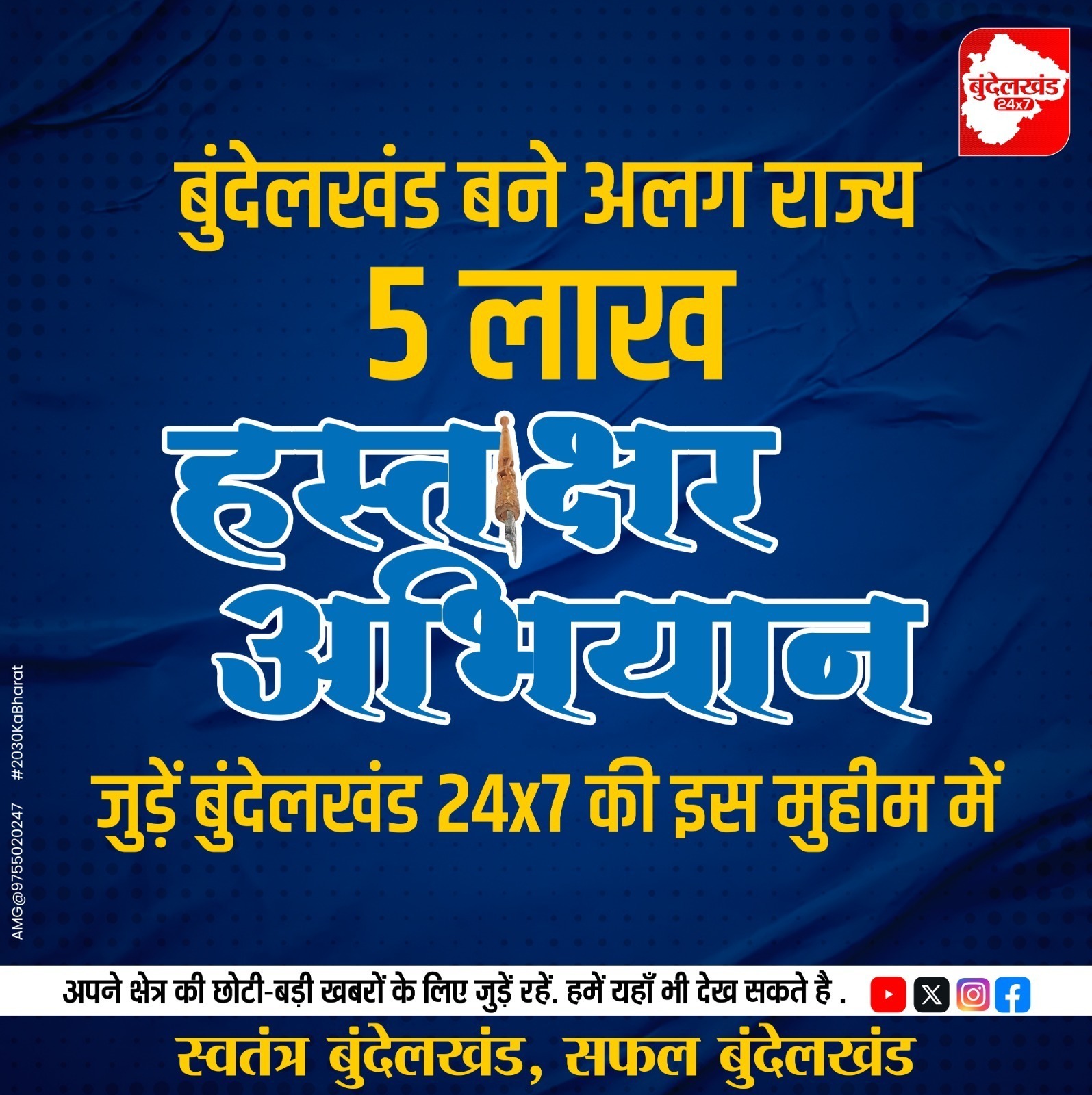 भोपाल/लखनऊ: स्वतंत्र बुंदेलखंड-सफल बुंदेलखंड के ध्येय के साथ कार्य कर रहे क्षेत्र के विश्वसनीय डिजिटल प्लेटफार्म बुंदेलखंड 24×7 न्यूज़ चैनल ने पृथक बुंदेलखंड राज्य की मांग को लेकर एक विशेष ‘5 लाख हस्ताक्षर’ अभियान की शुरुआत की है। इस अभियान का उद्देश्य बुंदेलखंड क्षेत्र की जनता की मांगों को केंद्र सरकार तक पहुंचाना है। इस अभियान के तहत चैनल ने ऑनलाइन और ऑफलाइन दोनों माध्यमों से हस्ताक्षर एकत्रित करने की व्यवस्था की है, ताकि अधिक से अधिक लोग इस मुहिम का हिस्सा बन सकें। https://forms.gle/oJMXGpMBr7xkTMe56 के माध्यम से अभियान से ऑनलाइन जुड़ा जा सकता है।