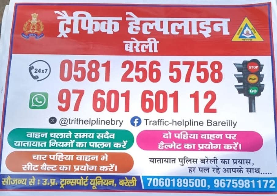इसके साथ ही बरेली ट्रैफिक पुलिस ने बताया कि नागरिकों की सहायता के लिए ट्रैफिक हेल्पलाइन हर समय सक्रिय है। किसी भी आपात स्थिति, दुर्घटना या यातायात समस्या के दौरान हेल्पलाइन नंबर पर संपर्क कर तत्काल सहायता प्राप्त की जा सकती है।
